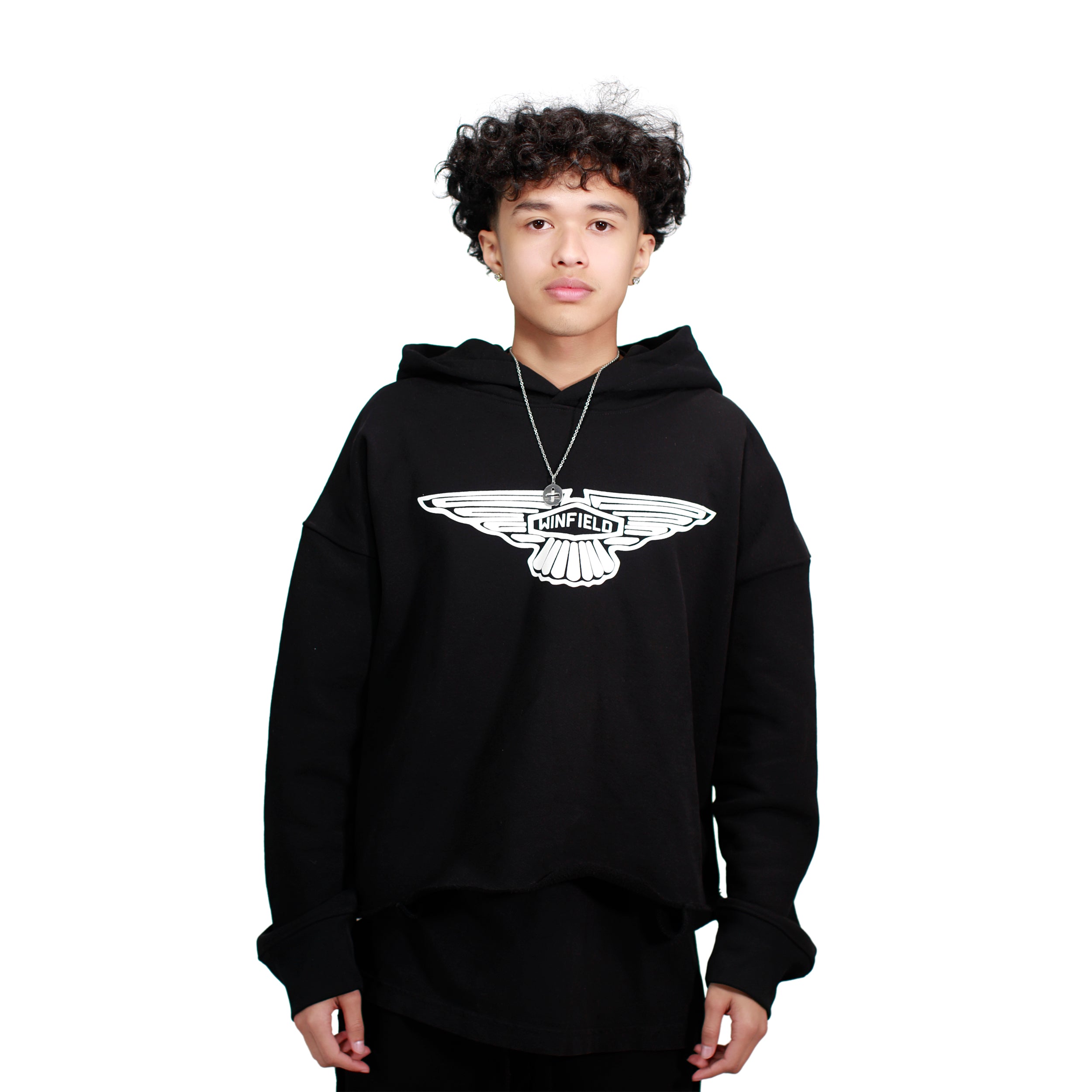 Elevate your street style with our exclusive heavyweight cotton hoodie. The slightly cropped and dropped shoulder design ensures a perfect, non-shrink fit. A wing inspired Winfield logo is screen printed on the center front. Made in Los Angeles with care, this versatile hoodie can be styled loose.